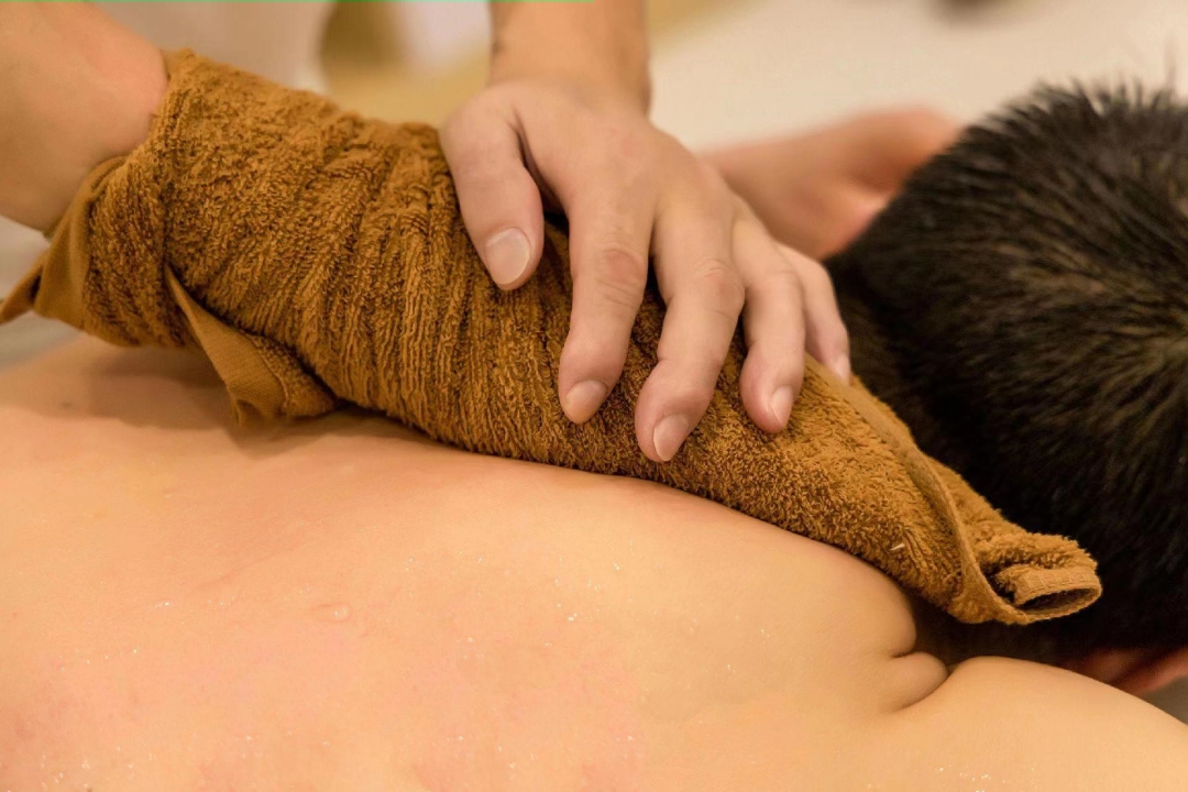 以扬州暖搓手法为主,并增加了杨式按摩法及扬州敲背法,以拉长线式手、力度均匀,姿势统一。